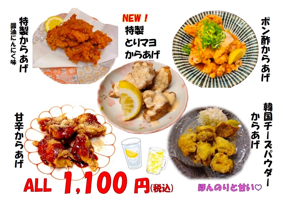 | からあげ | ◎特製からあげ ◎ポン酢からあげ ◎甘辛からあげ ◎韓国風チーズパウダーからあげ ◎とりマヨからあげ 各1,100円 |
